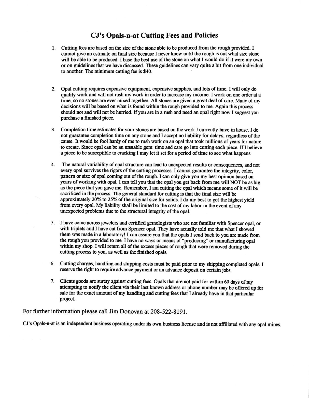 We cut Spencer opals from the rough you provide. There is NEVER a guarantee that your opal will finish. The only guarantee is that you WILL NOT be charged unless you receive a finished opal that is ready to be set. Pricing per finished triplet is $50 per stone regardless of size. Solid or matrix opals are charged by time spent cutting, minimum charge is $40. I do not and will not cut standard size solid or matrix opals, any solids will all be free-form opals.